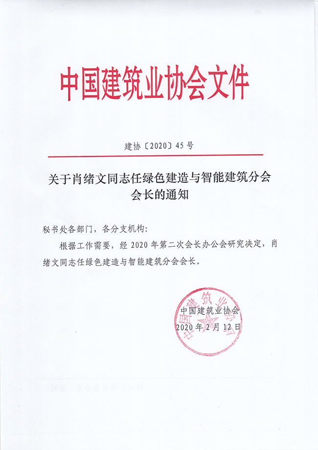 关于肖绪文同志任绿色建造与智能建筑分会会长的通知