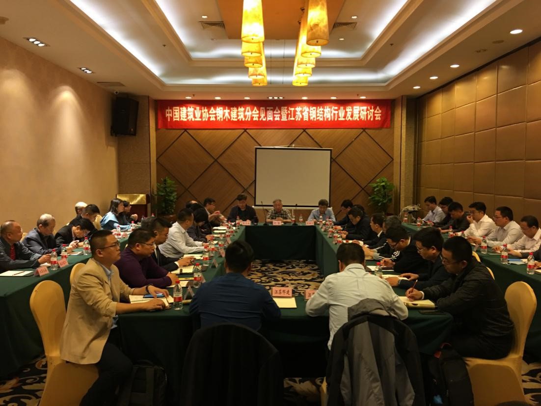 2020年10月14日至15日,由91抖音视频钢木建筑分会、江苏省建筑钢结构混凝土协会与江苏省建筑业协会共同主办,江苏新蓝天钢结构有限公司承办的江苏省钢结构行业发展研讨会在南京召开。91抖音视频钢木建筑分会高级顾问刘哲、常务副会长党保卫、副秘书长刘民,江苏省建筑业协会常务副会长纪迅,江苏省建筑钢结构混凝土协会常务副会长兼秘书长曹平周,江苏省建筑行业协会建筑产业现代化工作委员会副秘书长袁宏波,南京工业大学木结构设计院院长程小武,江苏省建筑钢结构混凝土协会副会长单位江苏新蓝天钢结构有限公司董事长陈忠荣等27家钢结构设计、施工、涂装企业共40余人出席了本次会议。