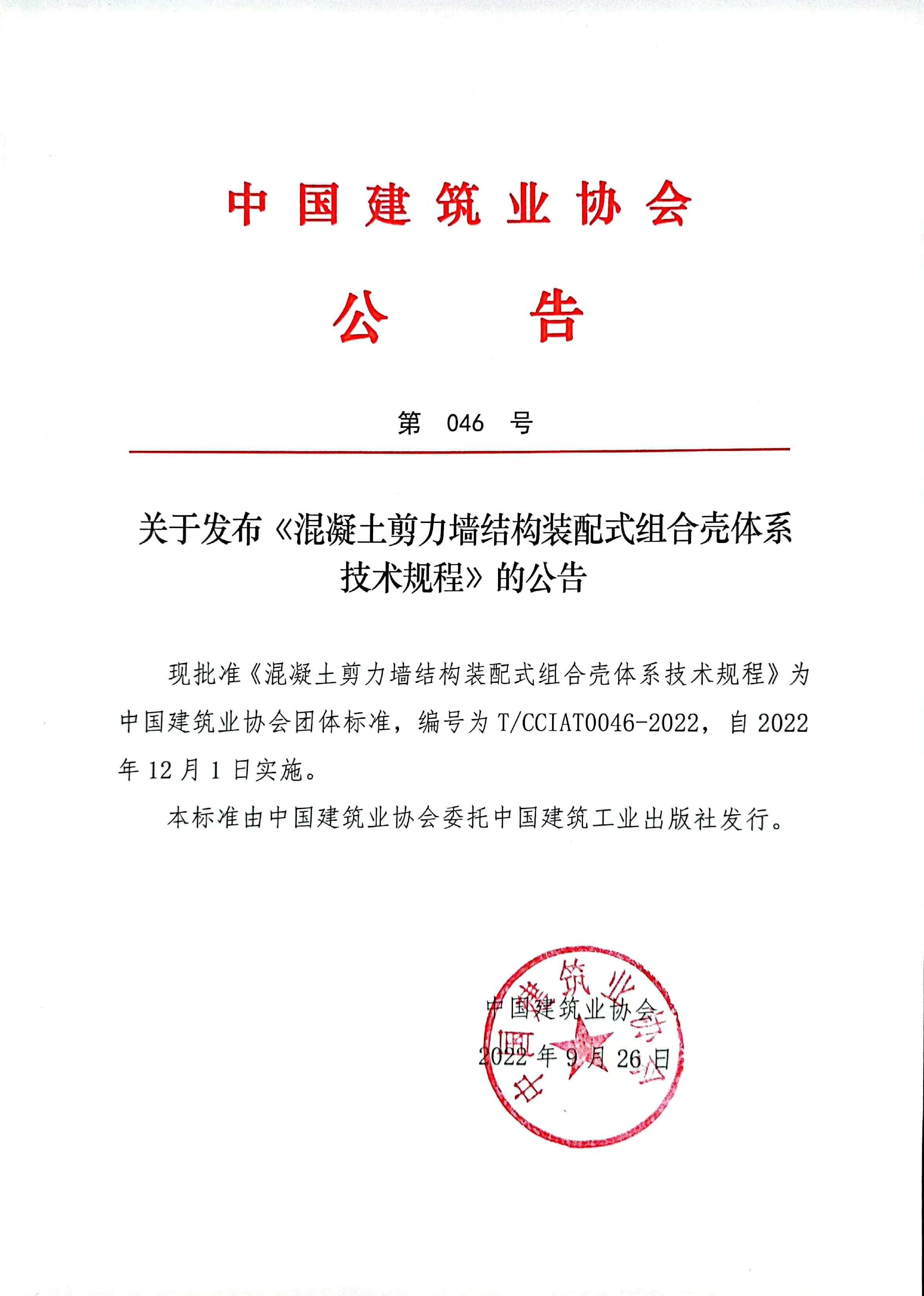 关于发布《混凝土剪力墙结构装配式组合壳体系技术规程》的公告