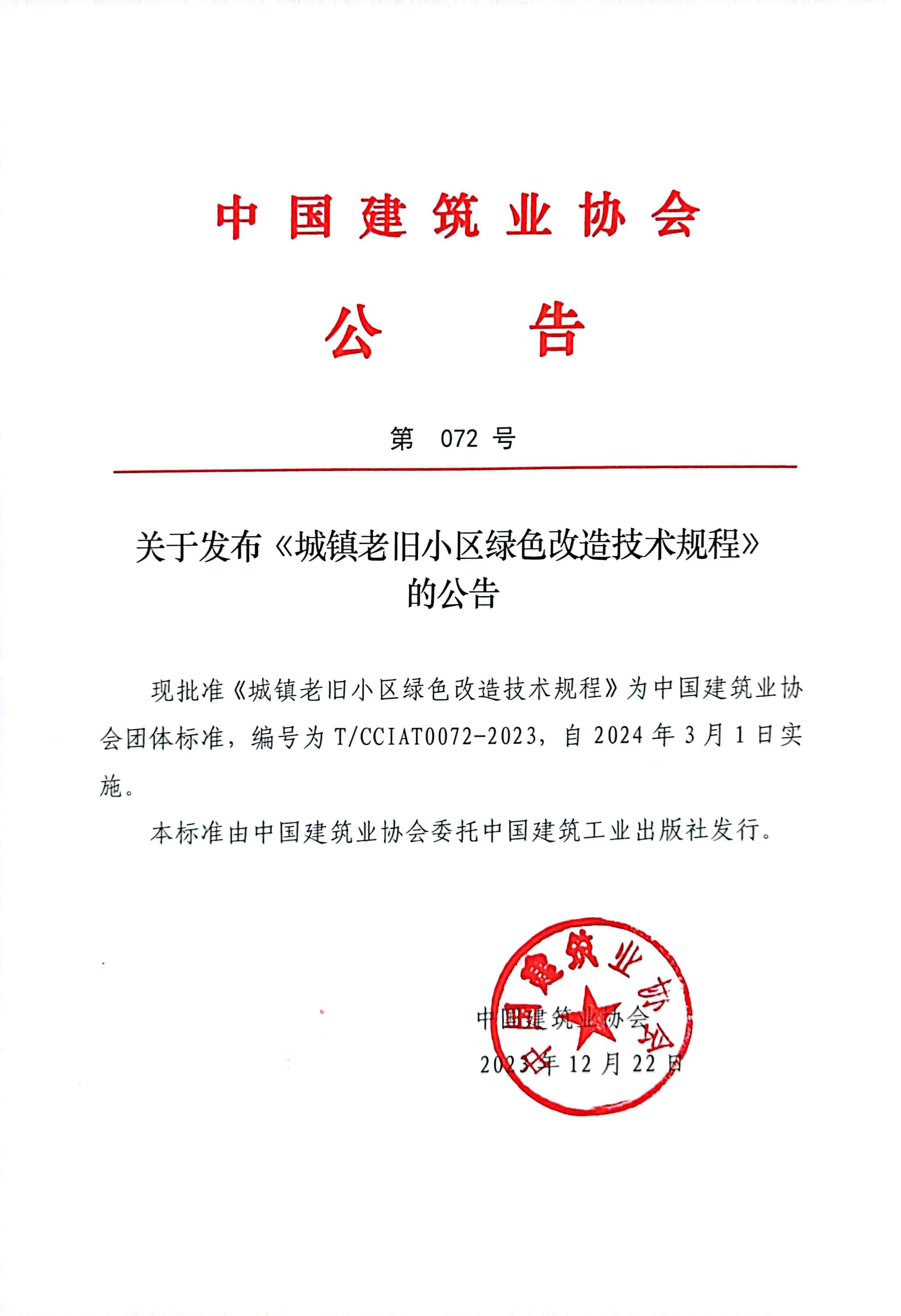 关于发布《城镇老旧小区绿色改造技术规程》的公告