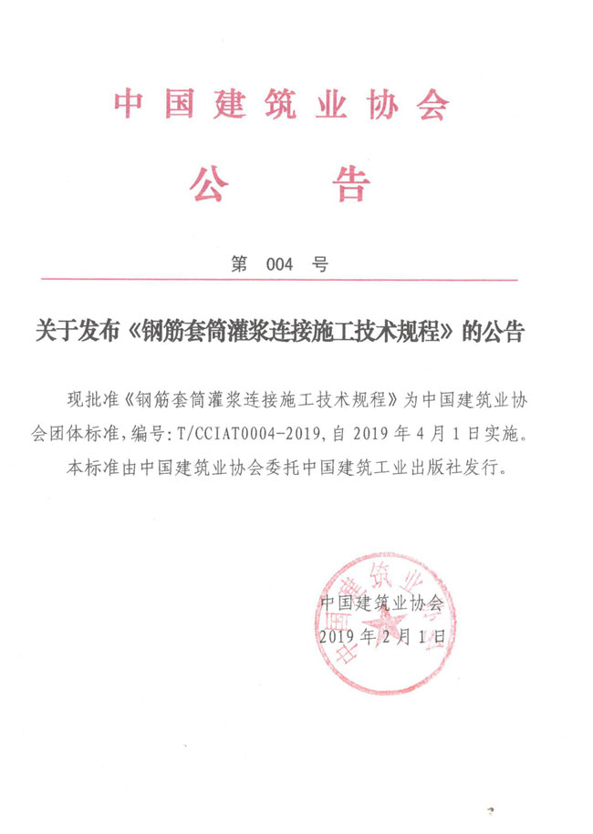 关于发布《钢筋套筒灌浆连接施工技术规程》的公告