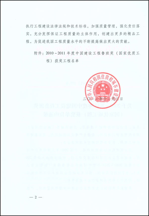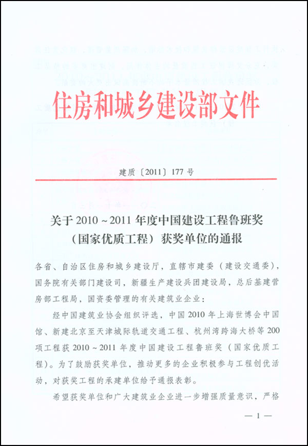 相关链接:关于2010~2011年度中国建设工程鲁班奖(国家优质工程)获奖单位的通报