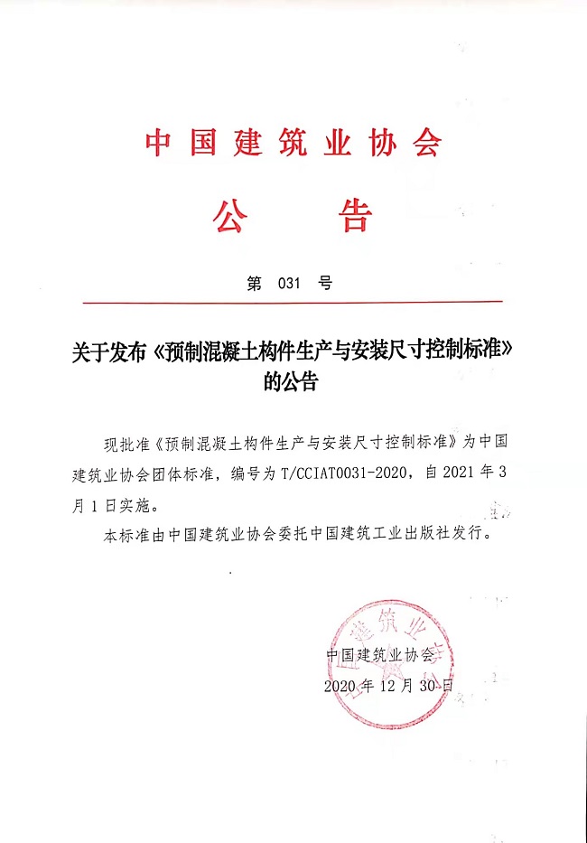 关于发布《预制混凝土构件生产与安装尺寸控制标准》的公告