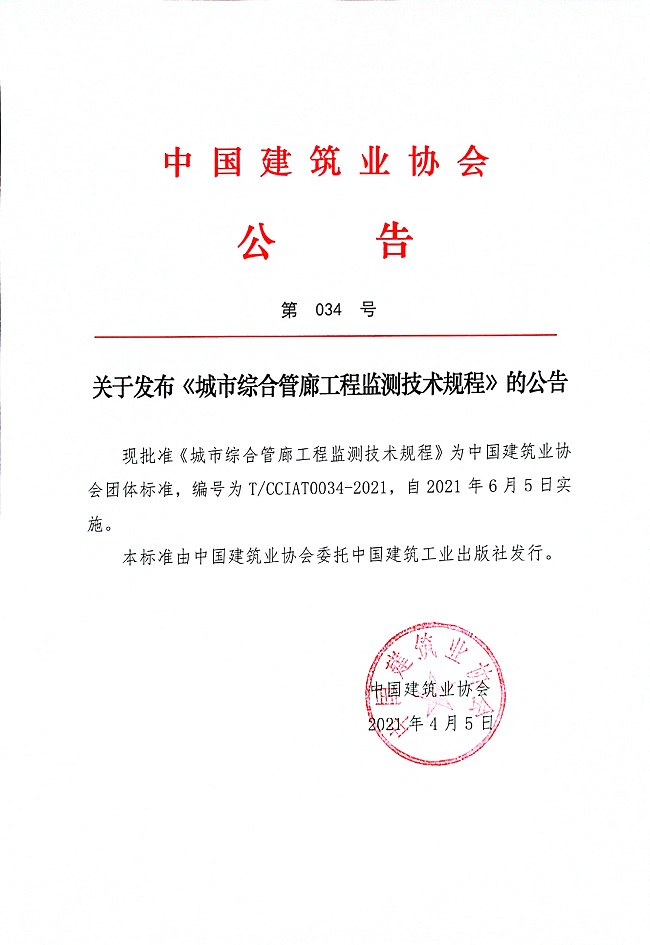 关于发布《城市综合管廊工程监测技术规程》的公告