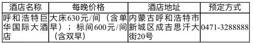 报到地点:呼和浩特巨华国际大酒店一层大堂(内蒙古呼和浩特市新城区成吉思汗大街20号,酒店电话0471-3288888)