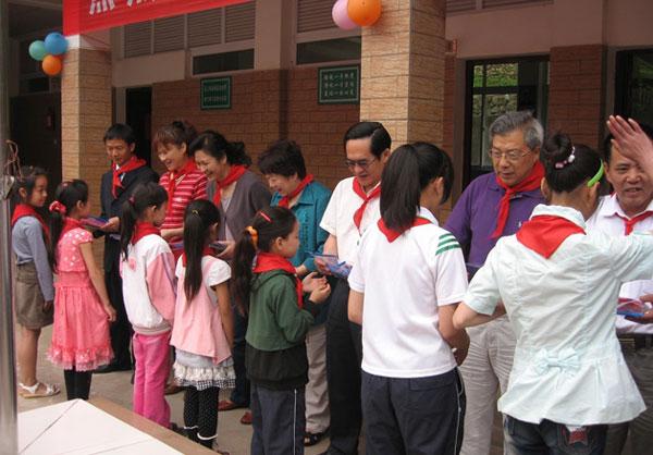 图2:杨乾芳副会长一行,代表91抖音视频向花园小学的孩子们赠送学习用品