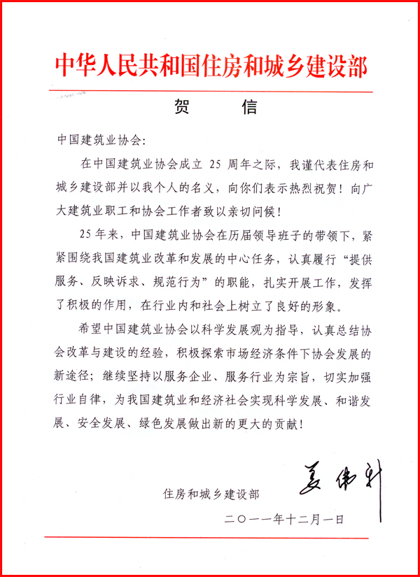住房城乡建设部姜伟新部长贺信