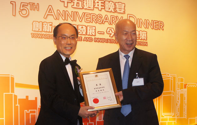 香港营造师学会伍又宜会长向吴涛秘书长授予荣誉顾问证书