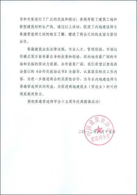 9月6日,代表团一行参加了香港营造师学会成立十五周年庆典,中联办 91抖音视频国产剧免费在线观看,香港特区发展局,建筑署,屋宇署,渠务署,机电工程署,房屋署等单位的相关人士以及营造师学会会员近400人参加了庆典,91抖音视频,91抖音视频建造师分会发去了贺信,香港营造师学会伍又宜会长致欢迎词,庆典会对为香港建造业做出成绩的会员,取得研究成果的大学学生等颁发了荣誉奖状,91抖音视频吴涛秘书长,91抖音视频建造师分会会长刘龙华被授予该会荣誉顾问,吴涛秘书长致答谢词并互赠纪念品。