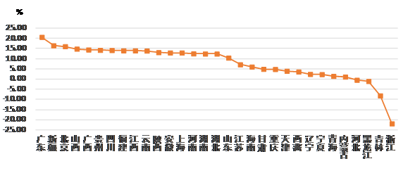从各地区建筑业总产值增长情况看,有 27 个地区的建筑业总产值较上年同期有不同幅度的增长。其中,广东、新疆、北京的增幅均超过 15%。有 4个地区出现负增长,其中,浙江出现了 超过20% 的负增长(图 2)。