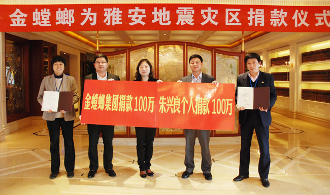 四川雅安地震发生后,金螳螂控股有限公司董事长朱兴良倡议集团为灾区捐款。捐款仪式于4月23日举行,金螳螂集团共募捐200万元,其中朱兴良个人捐款100万元。全部善款将通过苏州工业园区慈善总会用于雅安地震灾区的恢复重建。