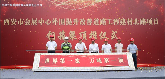 8月14日上午,中建三局西北公司西安市会展中心外围提升改善道路工程建材北路项目隆重举行万吨钢箱梁首次顶推仪式。西安市住建局党组成员、副局长翟金海,西安市住建局重点项目推进处处长顾金龙,中建三局西北公司党委副书记、总经理黄安平,中建三局西北公司总经理助理、基础设施事业部党委书记、总经理钱辉斌及分供商代表、项目部全体管理人员等共计200余人参加仪式。 中建三局西北公司党委副书记、总经理黄安平代表承建方致辞。他表示,项目团队要继续发扬三局“敢为天下先、永远争第一”争先精神和应急医院建设精神,科学筹划,精心组织,挂图作战,匠心建造,切实将建材北路跨灞河桥项目打造成,经得起历史和人民检验的地标工程、精品工程和民心工程,不辜负各级领导和广大市民对三局的支持和期待,为大西安实现追赶超越贡献三局力量, 西安市住建局重点项目推进处处长顾金龙发表了热情洋溢的讲话。他对项目团队精工细作,按期迈入最关键的钢箱梁架设阶段给与高度肯定。同时代表住建局对项目建设提出四点希望:一是持续强化疫情防控各项措施,巩固稳定向好的防控态势;二是继续深入贯彻落实安全生产主体责任,切实做好汛期防汛各项工作,确保作业人员及施工安全;三是高标准严要求做好绿色文明施工各项工作,以“精品工程”助力西安建设国家中心城市;四是加强过程管控,实现工程建设再提质、再提速、再提效,确保项目按期高质量建成投用。最后随着顾处长一身令下,“世界第一宽•万吨第一顶”长89m、重3000t的钢箱梁庞然大物隆重启程,开启了77m的顶推移动历程,这也标志着工程进入全面冲刺阶段。 期间,参加顶推仪式的领导还为生产一线工友们送上了清凉和慰问,并勉励他们再接再厉、力争上游。 仪式结束后,翟金海一行到建材北路项目现场调研指导,深入了解项目建设状况并提出了建设意见,鼓舞项目员工士气,确保完成工期,以良好精神面貌迎接十四运。 简介:据了解,西安市会展中心外围提升改善道路工程建材北路项目,是陕西省、西安市重点民生工程,是2021年全运会重要保畅工程。项目全长2,318公里,桥梁段全长1054,18米,主桥为钢箱梁结构,采用空间双索面自锚式悬索桥,桥面宽56米,长632米,重量达2,6万吨;引桥为双幅桥,采用预应力混凝土现浇梁桥。主桥采用半漂浮体系结构形式,桥身设计采用斜拉式桥,索塔全高123米,是西安市首座悬索桥,建成后将成为西安市地标性工程,世界上最宽的空间自锚式悬索桥。(通讯员:中建三局西北公司 谢伟、谭水才) 91抖音视频。