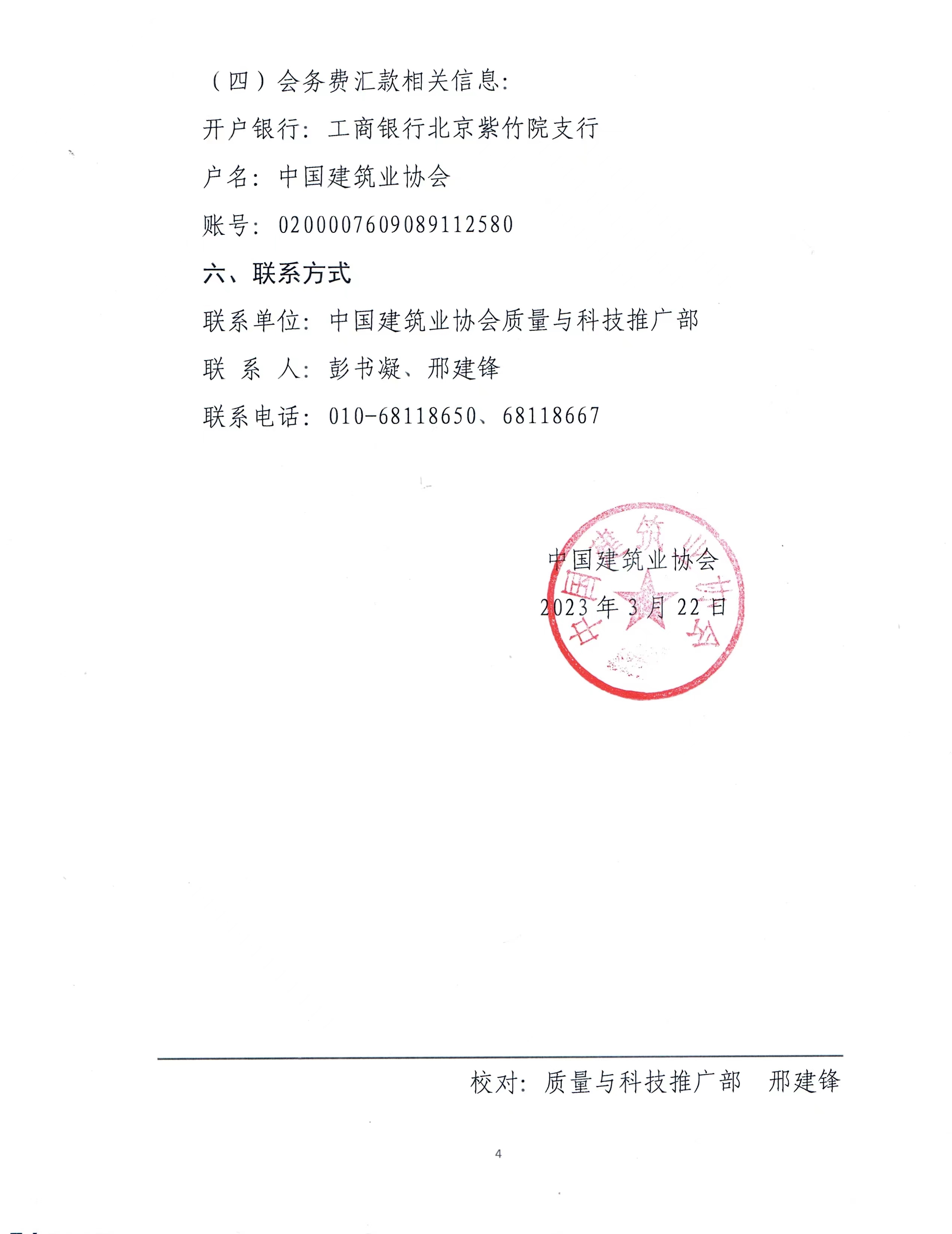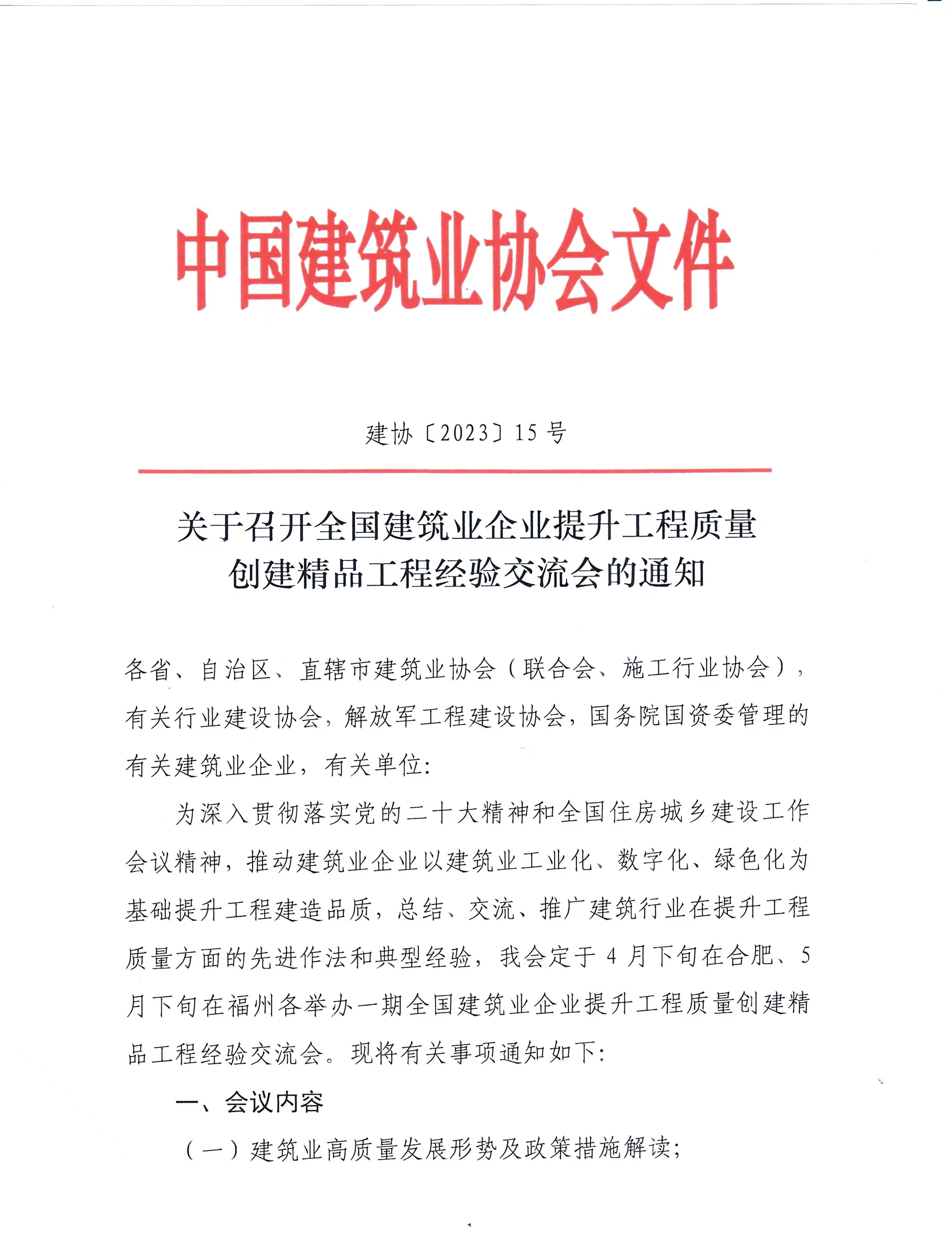 各省,自治区,直辖市建筑业协会(联合会,施工行业协会),有关行业建设协会,解放军工程建设协会,国务院国资委管理的有关建筑业企业 91抖音视频,有关单位: 为深入贯彻落实党的二十大精神和全国住房城乡建设工作会议精神,推动建筑业企业以建筑业工业化,数字化,绿色化为基础提升工程建造品质,总结,交流,推广建筑行业在提升工程质量方面的先进作法和典型经验,我会定于4月下旬在合肥,5月下旬在福州各举办一期全国建筑业企业提升工程质量创建精品工程经验交流会,(第一期合肥会议已成功召开,第二期福州会议正在积极报名中,)现将有关事项通知如下:。