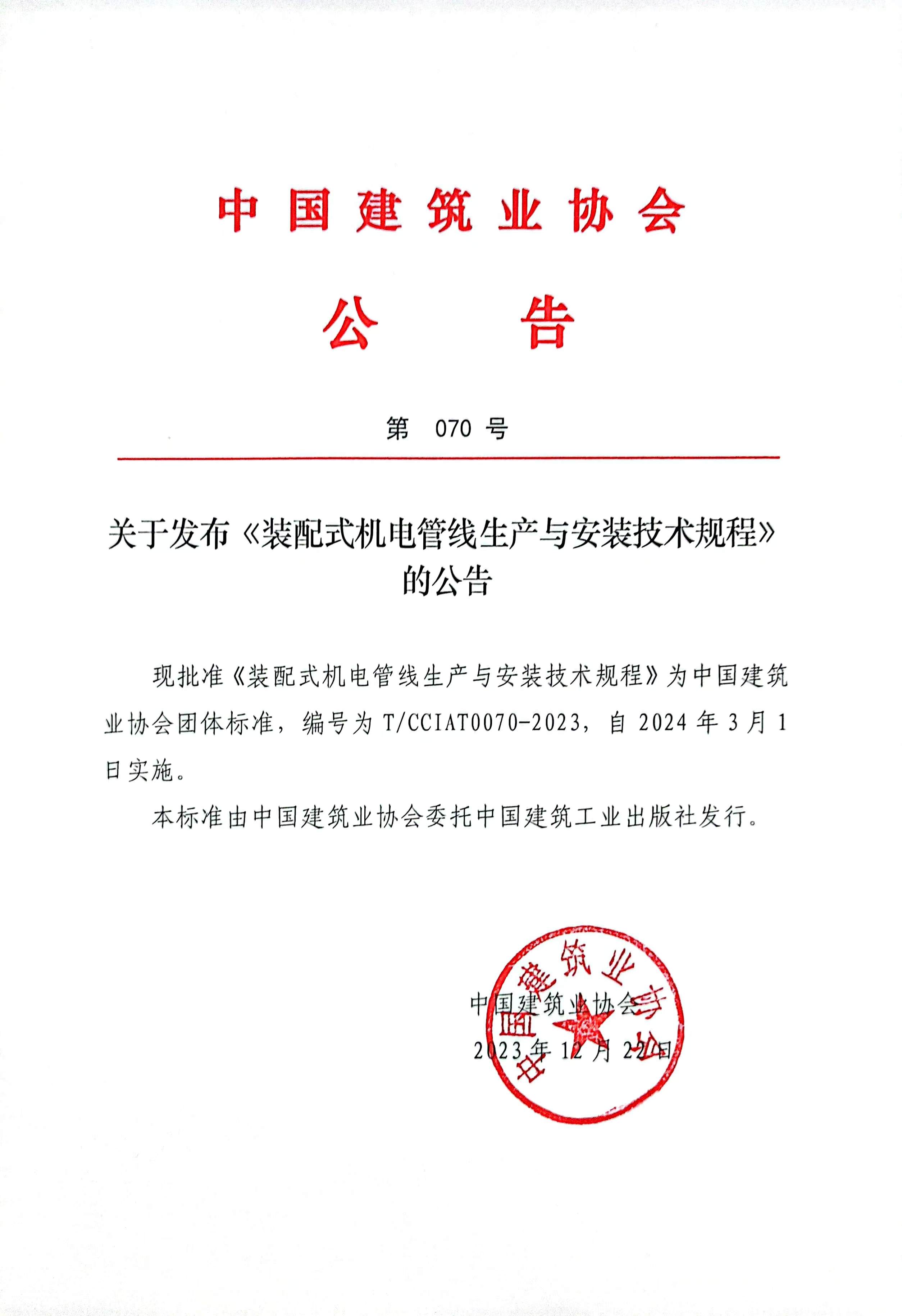 关于发布《装配式机电管线生产与安装技术规程》的公告