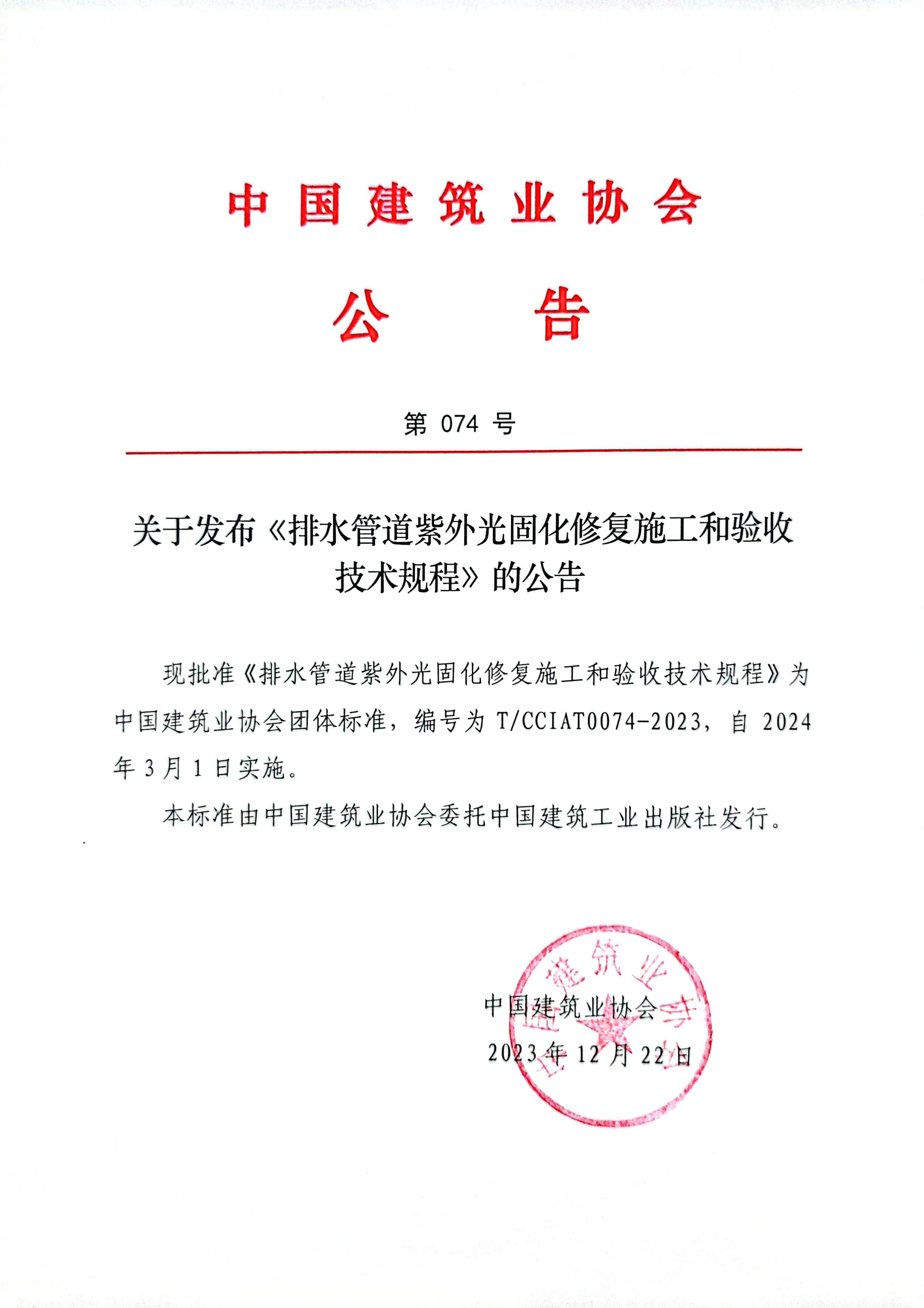 关于发布《排水管道紫外光固化修复施工和验收技术规程》的公告
