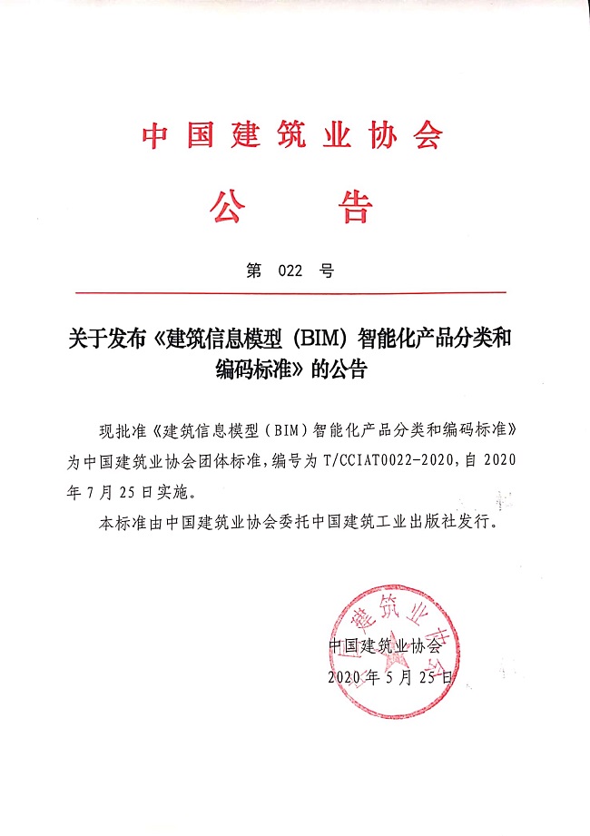 关于发布《建筑信息模型(BIM)智能化产品分类和编码标准》的公告