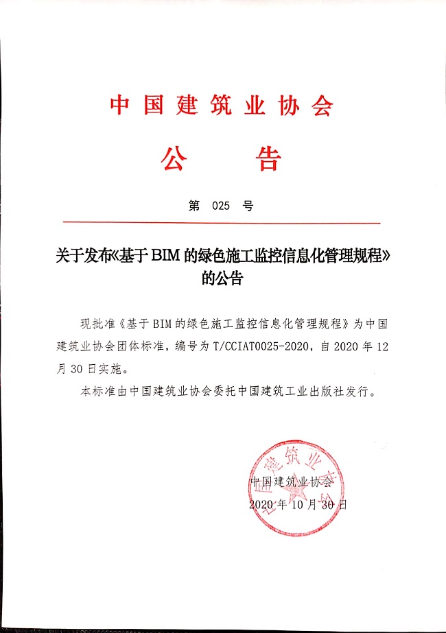 关于发布《基于BIM的绿色施工监控信息化管理规程》的公告