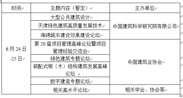 2021年6月24日,展会将举办首展开幕式及中国建筑科学大会,大会围绕建筑行业科技创新,探索行业发展方向及趋势等相关议题进行交流,设1个主论坛和若干 个分论坛。大会议程如下(暂定):