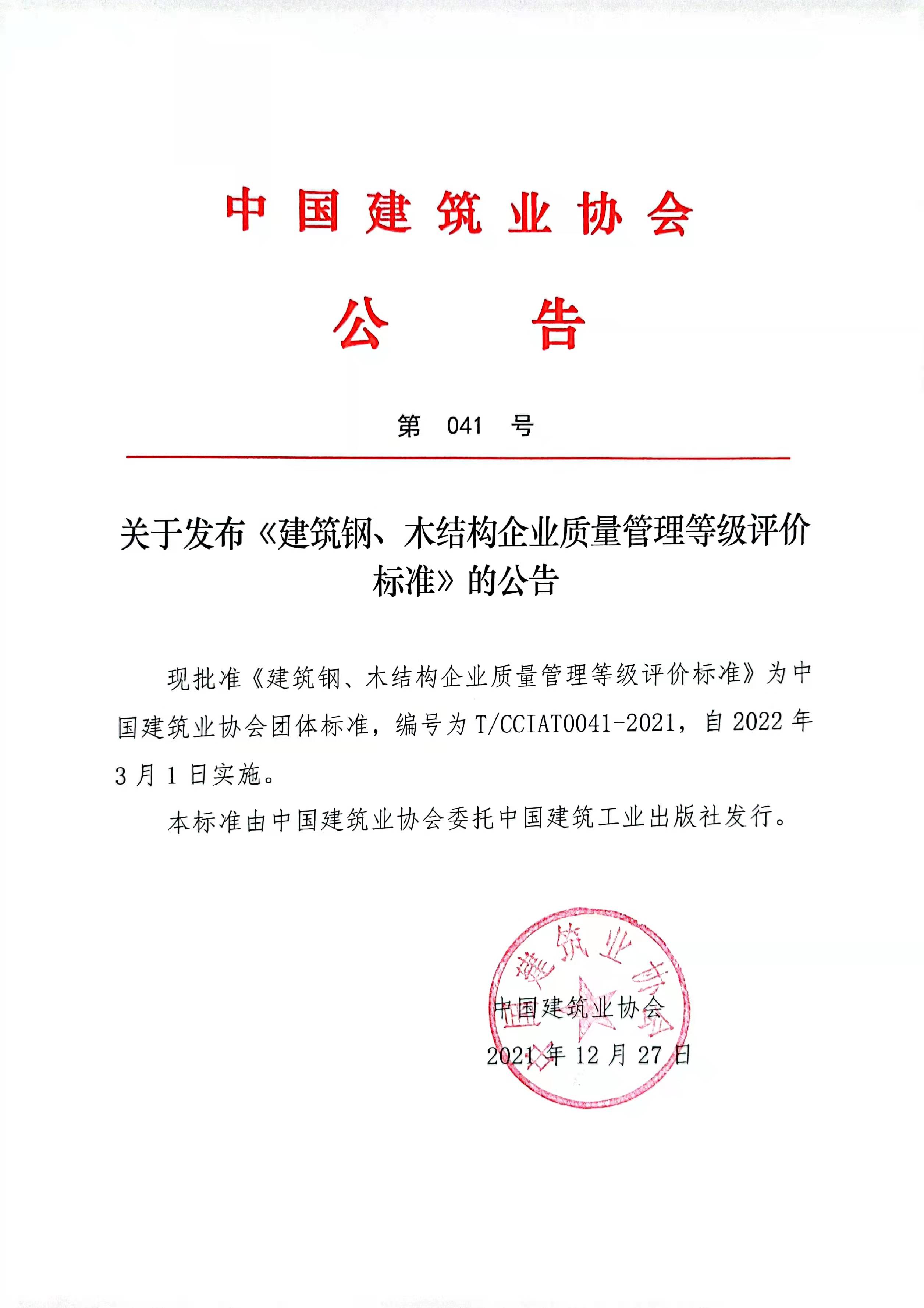 关于发布《建筑钢、木结构企业质量管理等级评价标准》的公告