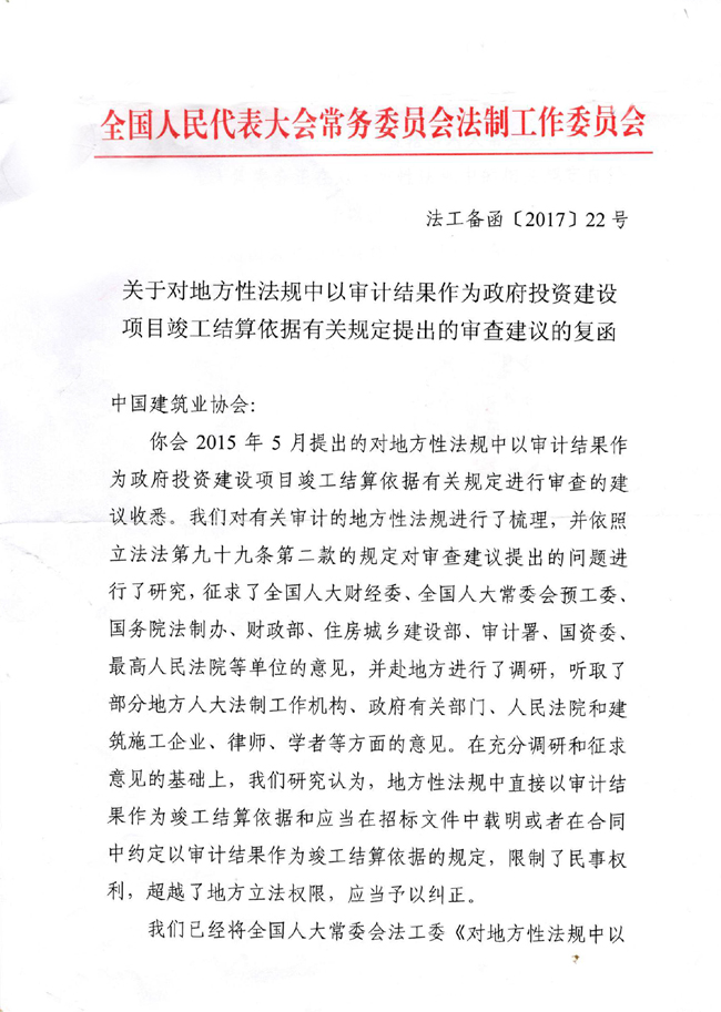 近年来,北京,上海,山东,江西等多个地区先后出台了地方性审计条例或审计监督条例,规定政府投资和以政府投资为主的建设项目“以审计结果作为工程竣工结算依据”,对此,广大施工企业反响强烈,呼吁撤销此规定,我会围绕此规定的合法性,合理性及对建筑市场各方主体的影响进行了调研,并与一些熟悉建筑市场的法律专家进行了认真研讨,认为此规定在一定程度上混淆了行政法律关系与民事法律关系的界限,超越了《审计法》和《审计法实施条例》规定的审计监督职能,也与合同双方平等自愿原则相矛盾,在实践中极大地损害了施工企业的合法权益,为此,我会联合26家地方建筑业协会和有关行业建设协会于2013年两次向全国人大常委会申请对规定“以审计结果作为工程竣工结算依据”的地方性法规进行立法审查,并建议予以撤销,2015年5月我会再次向全国人大常委会法工委提交申请,引起了法工委的高度重视,按照法工委的要求,我会补报了企业案例,进一步说明这一地方性法规给施工企业造成的经济损失, 6月5日,我会收到法工委《关于对地方性法规中以审计结果作为政府投资建设项目竣工结算依据有关规定提出的审查建议的复函》,《复函》提出,在收到我会于2015年5月提交的《关于申请对规定“以审计结果作为建设工程竣工结算依据”的地方性法规进行立法审查的函》后,法工委经过充分调研和征求意见,认为地方性法规中直接以审计结果作为竣工结算依据和应当在招标文件中载明或者在合同中约定以审计结果作为竣工结算依据的规定,限制了民事权利,超越了地方立法权限 91抖音视频,应当予以纠正,2月22日,法工委印发《对地方性法规中以审计结果作为政府投资建设项目竣工结算依据有关规定的研究意见》,要求各省,自治区,直辖市人大常委会对所制定或者批准的与审计相关的地方性法规开展自查,对有关条款进行清理纠正,6月13日,应法工委邀请,我会有关负责同志赴法工委办公室听取了此项工作的开展过程和最新进展情况,了解到各地现已完成自查,对相关条款的清理修订工作亦在抓紧落实, 至此,我会联合有关协会共同申请对规定“以审计结果作为工程竣工结算依据”的地方性法规进行立法审查的工作取得了圆满结果,有力维护了建筑业企业的合法权益。