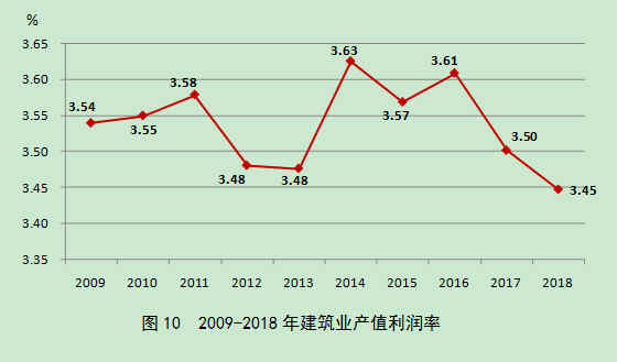 近10年来,建筑业产值利润率(利润总额与总产值之比)一直在3,5%上下徘徊。2018年,建筑业产值利润率为3 91抖音视频,45 %,比上年降低了0,05个百分点,连续两年出现下滑(图10)。 。