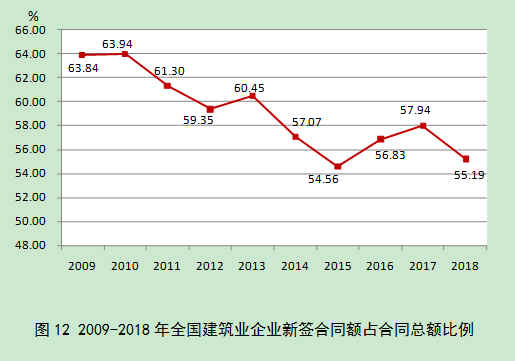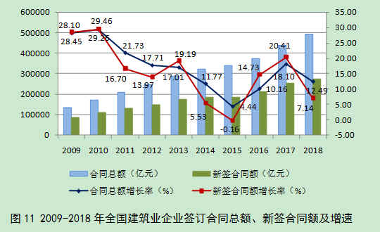 (五)建筑业企业签订合同总额、新签合同额总量保持增长 但增速双双放缓 2018年,全国建筑业企业签订合同总额494409,05亿元,比上年增长12,49%,增速比上年下降5 91成人抖音,61个百分点。其中,本年新签合同额272854,07亿元,比上年增长了7,14%,增速比上年下降13,27个百分点(图11)。本年新签合同额占签订合同总额比例为55,19%,比上年降低了2,75个百分点(图12)。 。