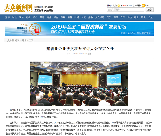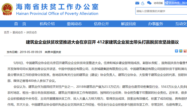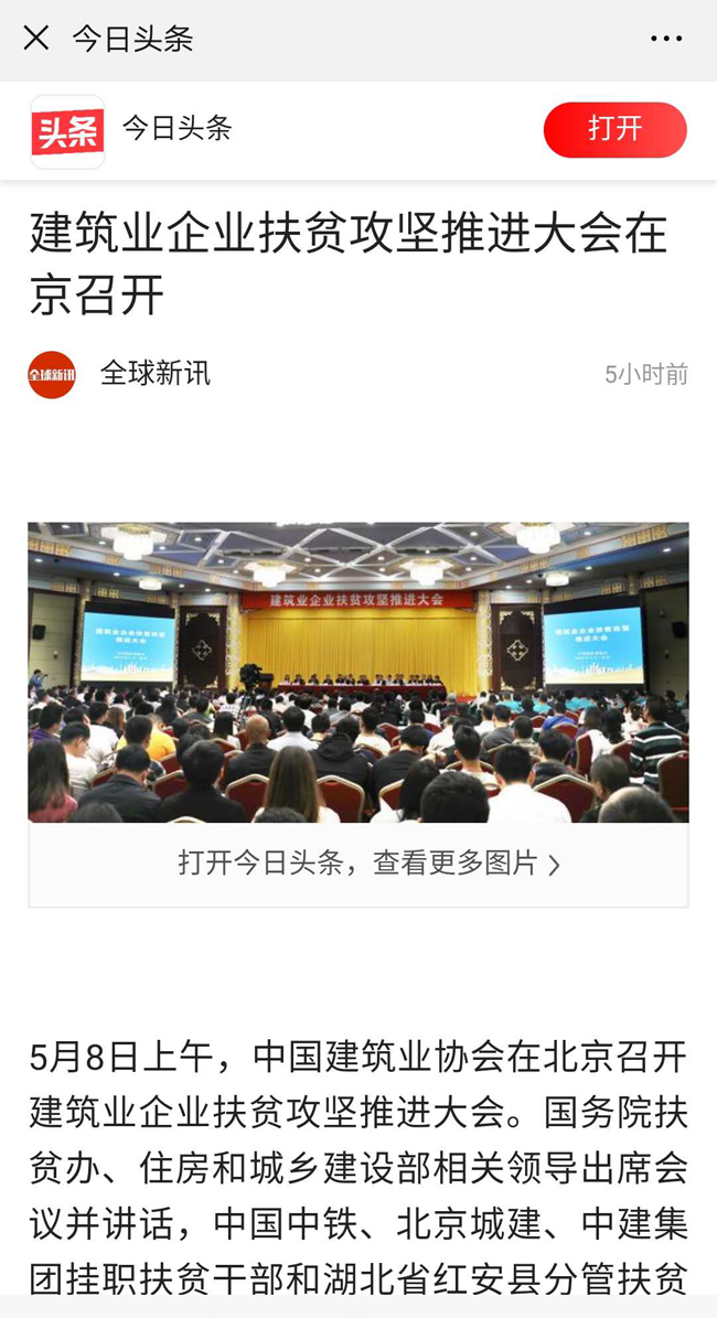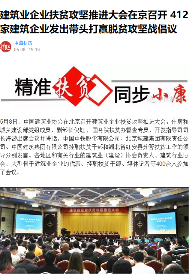 5月8日上午,91抖音视频在北京召开建筑企业扶贫攻坚推进大会,会议围绕建筑业企业发挥行业优势,助力打赢脱贫攻坚战广泛动员、深入交流。住房和城乡建设部副部长倪虹,国务院扶贫办稽查专员、开发指导司司长海波,以及住房和城乡建设部6个司和社团一党委的有关同志参加会议。倪虹副部长和海波司长分别发表讲话。各地区和有关行业的建筑业(建设)协会负责人,建筑行业协会、大型骨干建筑业企业的代表、挂职扶贫干部、媒体记者等400余人参加了会议。