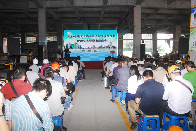 四川省建筑业协会执行会长杨乾芳、市建委副主任王建新、市建委建管处处长曾进及质监站、安监站、造价站等相关职能部门出席了会议,并为获得第一批绿色施工示范工程项目颁发示范牌。