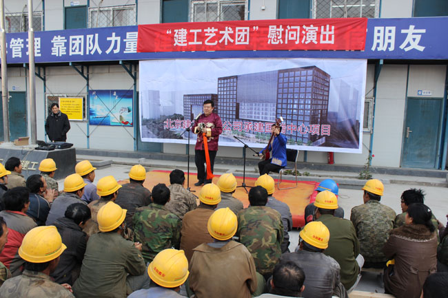 近日,北京建工集团工会副主席张利带领“建工艺术团”一行20余人来到北京建工四建公司承建的国瑞中心工地,为建设者们奉献了一台由集团职工精心排演的文艺节目,慰问参与该重点工程建设的200余名农民工和一线职工。