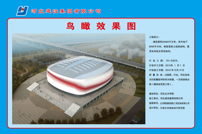 该工程总建筑面积2.63万平方米,钢筋混凝土框架结构,屋顶采用弦支穹顶结构,工程中标价7700万元,工期731天。该项目为2022年冬奥会的基础项目工程,它将有力促进我省体育事业的快速发展,为申办2022年冬季奥运会提供条件支撑。