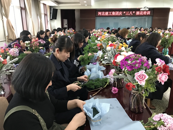 “看看我这个花插得漂亮吗,来,给我拍一张,” “我的也好看,咱俩一起拍,” “老师,看看我这一朵放到哪里更好看……” …… 3月8日上午,河北建工集团六楼会议室,70多名女职工置身鲜花丛中,用心学习鲜花养护知识,花语以及插花技巧, 培训开始前,集团工会主席王文利给女职工们送上了节日的祝福,希望女职工们像花儿一样绽放自己的青春,通过培训学会欣赏美,创造美,享受美,把自己的小家,把自己的工作和生活环境扮靓,用美好的心情,美丽的容颜,美丽的创造为小家增一份和谐,为集团发展贡献一份力量,为中国梦的实现增一抹最美的亮色, “插花,要学会舍弃,把多余的枝叶果断剪掉,这样才能把花养得更长久,造型才能更漂亮,这也恰如我们的人生,有舍才有得,”插花老师一边演示插花技巧,一边讲解花艺与人生哲理, 女职工们跟随老师,一枝枝地修剪去花枝多余的部分,按照老师的演示摆放好造型,然后小心翼翼地放到花瓶里,有的同志左看右看,总觉着有那么一点不满意,老师略微调整了一两枝,整个瓶插花的效果瞬间提升,于是乎,雀跃着开始各种摆拍, 等到了利用花泥插花的阶段,老师说要把花枝再次剪短,插在花泥上才有效果, “你们愿意剪短,还是保留瓶插花,”老师问询道, “还是保留瓶插花吧,”多数女职工这样回答, 老师的一句提问,引发了女职工们的万般不舍,谁都不舍得把插好的花儿剪短再重新造型,千挑万选之下,大家利用剩余的细松枝和差点舍弃的小花,居然也做出了一个个不错的小装饰花 91抖音视频,给了大家又一份惊喜, 培训接近尾声时,集团党委副书记张庆虎赶到现场给大家鼓劲加油,他幽默风趣的庆三八对联,引发了全场的欢笑,他祝福大家全家幸福,阖家欢乐,工作顺利,永远美丽, 最后女职工们手捧自己的作品与集团领导合影留念,留住这美好欢乐的瞬间, 为组织好本次活动,集团工会女工委和集团妇工委提前做了大量的筹备工作,为女职工欢度三八节创造了条件,(供稿人 张秋英)。