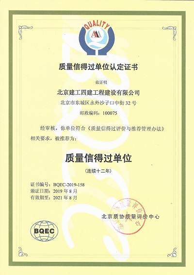 近日,经北京质协质量评价中心审核,北京建工四建工程建设有限公司符合《质量信得过评价与推荐管理办法》相关要求 91抖音视频,连续12年被认定为“质量信得过单位”,有效期两年,至2021年8月,这充分体现了四建公司在工程质量管理工作方面的高水平和高标准。