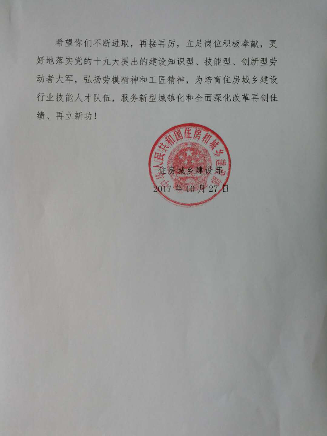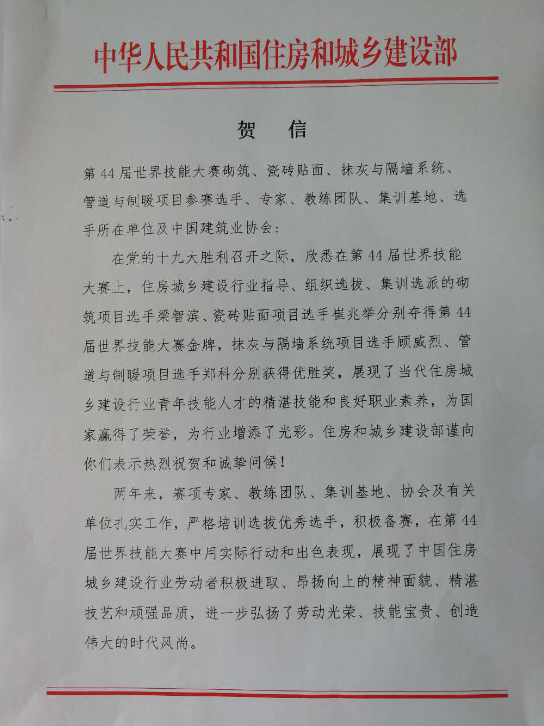 10月27日和25日,住房城乡建设部部长王蒙徽、副部长易军分别就部人事司关于第44届世界技能大赛,我们91抖音视频建筑企业经营和劳务管理分会在部人事司指导下组织选拔、集训选派的建设行业选手参赛情况的签报上作出批示,并以住房城乡建设部名义向我会及获奖选手、专家、教练团队、集训基地、选手所在单位发来贺信。贺信全文如下: